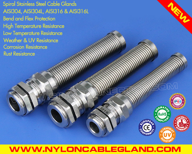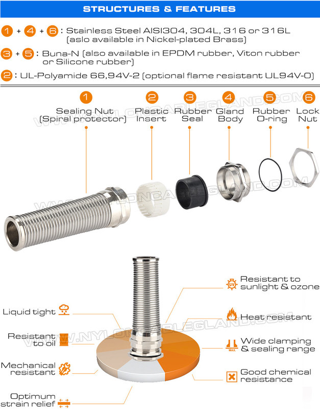 Con ventajas de alta resistencia al impacto y amplio rango de sujeción, resistencia a altas y bajas temperaturas y resistencia a la intemperie, los prensaestopas herméticos para cables métricos IP68 M12~M50 de acero inoxidable tipo 304/316/316L con protección contra torceduras y dobleces vienen con un resorte protector en espiral adicional. y tiene la capacidad de resistencia química, resistencia a la corrosión y resistencia al calor, y también tiene la capacidad de alta resistencia a la tracción, alta tenacidad, buena resistencia al agua, excelente protección contra la flexión y largo tiempo de servicio.