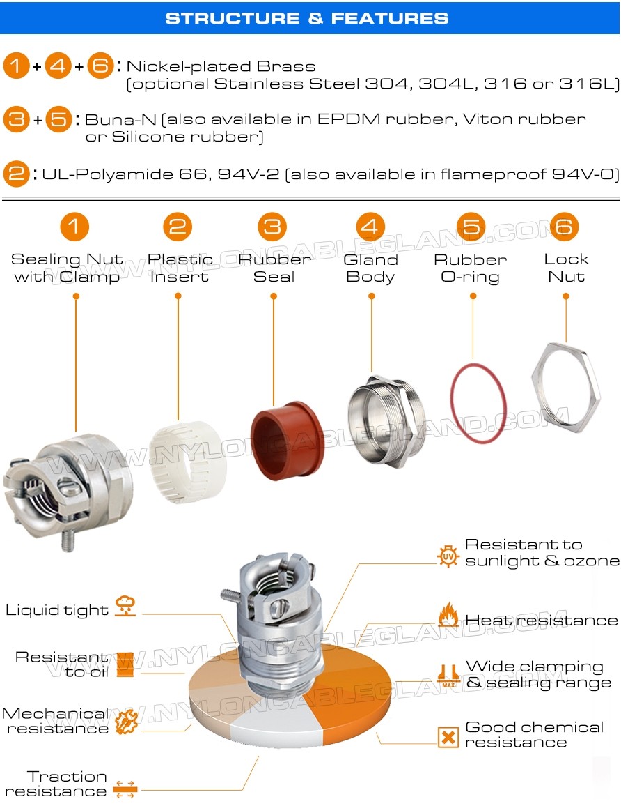 | Las principales ventajas: | La exquisita mano de obra y el hermoso aspecto, el diseño único de la tuerca de sellado y los sellos pueden proporcionar un alto alivio de la tensión y proteger el cable contra la extracción.el aceite, grasa y solvencia común |