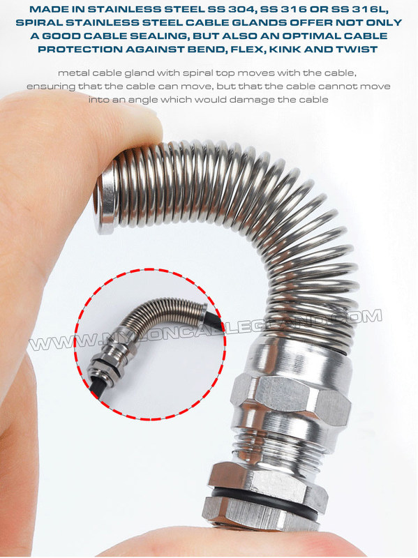 Conector prensaestopa espiral PG de acero inoxidable AISI 316L, AISI 316, AISI 304 (IP68) con alivio de tensión viene con un protector en espiral adicional que puede evitar que los cables se doblen y rompan excesivamente y ayuda a extender la vida útil del cable.