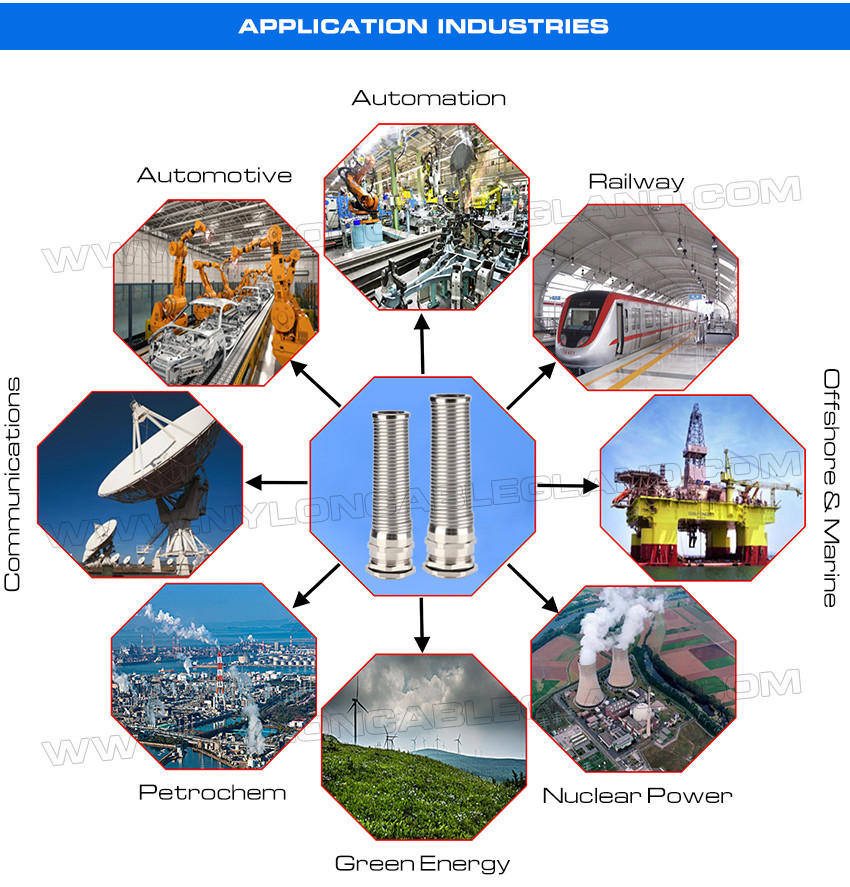 Los prensaestopas metálicos en espiral de acero inoxidable con protección contra torceduras y torceduras tienen la capacidad de resistencia química, resistencia a la corrosión y resistencia al calor, y también tienen la capacidad de alta resistencia a la tracción, alta tenacidad, buena resistencia al agua, excelente protección contra la flexión y largo tiempo de servicio. . Son resistentes al polvo, la suciedad, el agua de mar, el ácido, el alcohol, el aceite, la grasa y los disolventes comunes. Son populares en las aplicaciones de construcción naval, tecnologías eléctricas y electrónicas, telecomunicaciones, control automático, fuentes de alimentación, módulos solares fotovoltaicos, inversores, iluminación, cámaras de vigilancia, ingeniería de plantas, máquinas y otros entornos hostiles o corrosivos, etc.