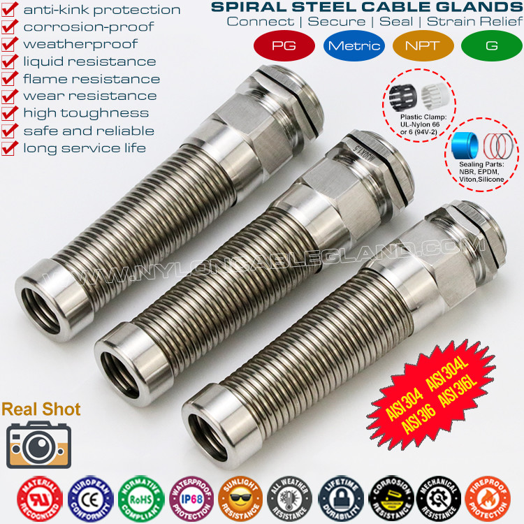 Los prensaestopas metálicos en espiral de acero inoxidable con protección contra torceduras y torceduras tienen la capacidad de resistencia química, resistencia a la corrosión y resistencia al calor, y también tienen la capacidad de alta resistencia a la tracción, alta tenacidad, buena resistencia al agua, excelente protección contra la flexión y largo tiempo de servicio. . Son resistentes al polvo, la suciedad, el agua de mar, el ácido, el alcohol, el aceite, la grasa y los disolventes comunes. Son populares en las aplicaciones de construcción naval, tecnologías eléctricas y electrónicas, telecomunicaciones, control automático, fuentes de alimentación, módulos solares fotovoltaicos, inversores, iluminación, cámaras de vigilancia, ingeniería de plantas, máquinas y otros entornos hostiles o corrosivos, etc.