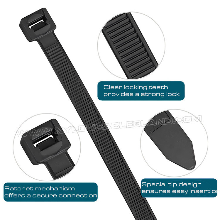 Están diseñadas para asegurar haces de cables y componentes de arneses rápidamente sin que se resbalen. Con una cabeza autoblocante, la mayoría de los cintillos precintos cinchos están diseñadas para soportar temperaturas de 40 °F (-40 °C) a 185 °F (85 °C), están disponibles en varias longitudes, anchos y resistencias. Fabricadas en poliamida 66 (nailon 66) aprobada por UL, inflamabilidad 94V-2, tienen las características de resistencia a los ácidos, resistencia a la corrosión y buen aislamiento y no envejecen fácilmente y tienen una gran capacidad de carga. Estas bridas para cables se utilizan ampliamente en fábricas de regalos navideños, fábricas de productos electrónicos, fábricas de procesamiento de cables, fábricas de cables y alambres, fábricas de juguetes, festivales festivos, grandes almacenes de artículos de papelería, supermercados de productos frescos, uso diario residencial, electrodomésticos, conectores, agricultura, jardinería, iluminación, artesanías, etc. industrias.
