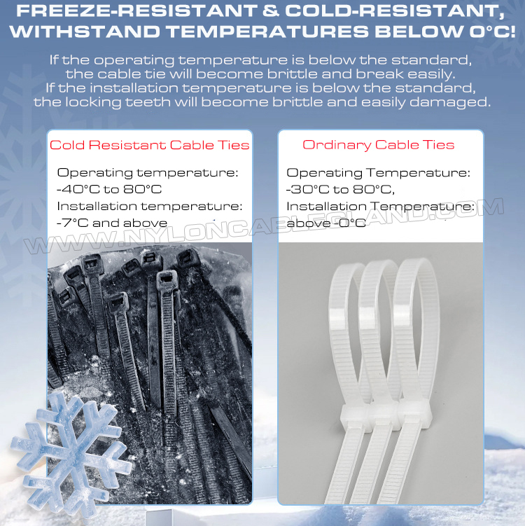 Los cinchos cintillos precintos flejes amarres resistentes a bajas temperaturas (también conocidas como cinchos sujetacables bridas resistentes a la congelación o zunchos sunchos tirras tirraps tirrajes amarres resistentes a las heladas) son bridas para cables de nailon diseñadas para entornos fríos. Están fabricadas con materiales especiales de nailon resistentes a bajas temperaturas (como el PA6.6 modificado). Entre sus ventajas se incluyen una excelente resistencia al choque térmico (resistencia a la fractura frágil), alta resistencia, alta resistencia al desgaste, buena estabilidad dimensional y excelentes propiedades químicas y eléctricas. Mantienen su resistencia, tenacidad y resistencia a la fragilidad a temperaturas extremadamente bajas (como -40 °C), inferiores a las del nailon estándar. Se utilizan especialmente para fijar equipos en zonas frías o en sectores industriales que requieren materiales resistentes a bajas temperaturas para garantizar una fijación firme y segura.